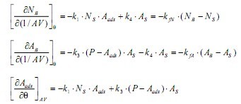 其中:NB—煙氣中的NOx濃度(ppm);AB—煙氣中NH3的濃度(ppm);Ns—催化劑表面的NOx濃度(ppm);KfN—催化劑表面NOx傳質(zhì)系數(shù)(m/h); P—催化劑表面的活性區(qū)域(ppm);AV—表面速度(m/h);Aads —參與反應(yīng)的NH3的濃度(ppm); K1,K3,K4—反應(yīng)速率常數(shù);KfA—催化劑表面NH3傳質(zhì)系數(shù)(m/h);AS—催化劑表面NH3的濃度(ppm)。