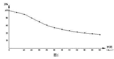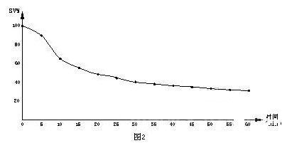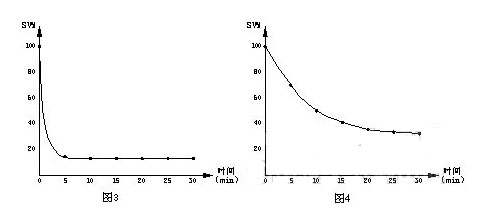 SVI>200時,污泥發(fā)生膨脹。其沉淀性能差,圖1、圖2兩曲線的共同特點是前5分鐘沉降的效果很差沉降效率低于15%,活性污泥絮凝體質(zhì)輕、分散、松散,凝聚和沉淀性能都差。此種情況下采取了加大剩余污泥排放量,盡快排出性能已惡化的污泥,同時盡量減少污水在一沉池的停留時間,使曝氣池進水中的SS值提高,以較短的時間在曝氣池中形成良好的活性污泥。