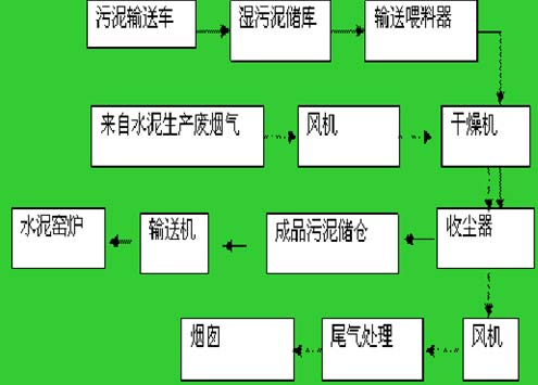 污泥干化采用的熱源來自現(xiàn)有的熟料生產(chǎn)線預(yù)熱器出口廢熱煙氣,通過風(fēng)機鼓入干燥機干燥室進口。需要干化的濕污泥由專用的輸送裝置送至污泥儲料小倉,然后送到干燥機干燥塔氣固兩相進行對流型干燥。完成熱交換后的污泥和煙氣一起進入袋收塵器,收塵后的干泥污泥顆粒送入成品污泥儲倉;尾氣經(jīng)處理后排放;流程簡單,處置徹底。