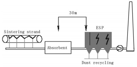 Philip J1A 研究指出,煙道活性炭噴射法可有效去除燒結(jié)煙氣中二噁英的含量 ,此法所用吸附劑為95μm 的褐煤活性焦 ,可使煙氣中二噁英的濃度降至0.3~0.4 ng I-TEQ/m3,該系統(tǒng)如下圖。