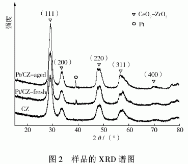 由圖2所示的XRD分析結(jié)果可見,CZ樣品為 立方晶相的螢石結(jié)構(gòu),各衍射峰的對(duì)稱性較好,沒有 四方結(jié)構(gòu)的單一ZrO2存在,說(shuō)明所制備的樣品為 單一晶相固溶體結(jié)構(gòu)。當(dāng)在CZ樣品上負(fù)載Pt以 后,由于PtO2(2θ=27.95°,強(qiáng)度為100)和PtO(2θ= 33.90°,強(qiáng)度為 100)與CZ樣品的111晶面(2θ= 28.87°,強(qiáng)度為100)和200晶面(2θ=33.70°,強(qiáng)度 為35)的特征衍射峰很接近,即使存在這類結(jié)構(gòu)也 被CZ樣品的峰所掩蓋,所以Pt/CZ-fresh樣品的 XRD譜圖分析不能確認(rèn)是否有PtO2和PtO這兩 種化合物存在,但是在39° 附近新出現(xiàn)了對(duì)應(yīng)于Pt0 的特征衍射峰,這可能是由于PtO2和PtO在高溫 下分解并發(fā)生團(tuán)聚所引起的[6]。經(jīng)過(guò)水熱老化后 Pt/CZ-aged 樣品各衍射峰變得更加尖銳,峰形變窄,說(shuō)明樣品均有不同程度的燒結(jié),導(dǎo)致晶粒長(zhǎng)大, 通過(guò)謝樂公式計(jì)算發(fā)現(xiàn)其晶粒度陡增至78.239 nm。