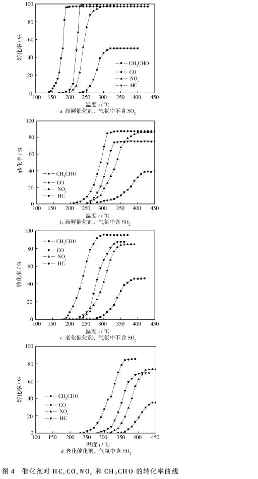 由于汽車用催化劑要求在空速變化大,溫度變化大,高水蒸氣濃度,毒物存在的嚴(yán)酷環(huán)境中工作 有時(shí)還會(huì)暴露在1 000℃以上的高溫環(huán)境。因此乙醇燃料發(fā)動(dòng)機(jī)凈化所用的催化劑除了必須有較強(qiáng)的耐高溫抗老化性能和較低的起燃溫度以及較好的三效活性外,還需對(duì)其他污染物具有良好的凈化能力。表2和圖4示出催化劑老化前后對(duì)HC,CO NOx和CH3CHO的轉(zhuǎn)化率與溫度的關(guān)系,同時(shí)還給出了氣氛中SO2對(duì)催化劑催化活性的影響,表中 t50表示當(dāng)轉(zhuǎn)化率為最高轉(zhuǎn)化率的50%時(shí)所對(duì)應(yīng)的溫度。