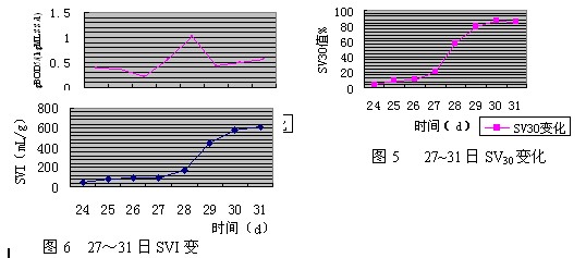 由上表可看出實際進(jìn)水BOD5及CODcr的均值在設(shè)計值的3倍以上,這使得有機(jī)物消解去除顯得尤為重要。而實際中,BOD5及CODcr變幅波動相當(dāng)大,造成了極大的水質(zhì)沖擊負(fù)荷。圖2為進(jìn)水BOD5和CODcr變化情況。 在調(diào)試過程初期系統(tǒng)受到了極大的沖擊負(fù)荷。下圖為3月24日~3月31日進(jìn)水F/M及相應(yīng)的SV30變化情況。從圖5可以看出,在26日以前系統(tǒng)以中等負(fù)荷0.3~0.5kgBOD5/(kgMLSS.d)運行,SV30呈穩(wěn)定增長趨勢,27日增至20%。28日,F(xiàn)/M猛增至1.02,SV30于29日攀升至80%以上(圖7),SVI至573.3mL/g,并一直居高不下(圖8),呈現(xiàn)嚴(yán)重的污泥膨脹。