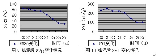 在活性污泥培養(yǎng)初期產(chǎn)生了嚴(yán)重的污泥膨脹后,不宜直接采用排泥來降低SV30,因為此時MLSS濃度僅1000~1200mg/L。實際上在前期發(fā)生污泥膨脹后,即對系統(tǒng)進(jìn)行了有效的F/M及DO控制,膨脹未繼續(xù)惡化,側(cè)溝云浪狀污泥上浮也很快消失。但SV30一直居高不下,造成膨脹的隱患。這是由于已經(jīng)膨脹了的污泥積累在氧化溝內(nèi),未得到有效的排除,所以一直影響著氧化溝內(nèi)污泥的性能。一般污泥膨脹發(fā)生速度很快,只要2~3天,而膨脹污泥的恢復(fù)很緩慢,往往需要3倍泥齡以上的時間。通過排泥,將氧化溝內(nèi)積累的大量沉降性能極差污泥及時排走,實踐證明這是一種有效降低SV30,改善污泥沉降性能的方法。圖11和圖12是排泥后(4月20日開始排泥)SV30和SVI的變化情況?梢,排泥后污泥的沉降性能以及污泥指數(shù)都得到了很大的改善。