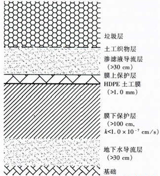 在傳統(tǒng)衛(wèi)生填埋場(chǎng)設(shè)計(jì)中,要求填埋場(chǎng)必須進(jìn)行防滲處理,以防止?jié)B濾液對(duì)地下水和地表水的污染,同時(shí)阻止地下水進(jìn)入填埋區(qū)。同樣生物反應(yīng)器填埋場(chǎng)的防滲系統(tǒng)設(shè)計(jì)是必須的,但對(duì)其結(jié)構(gòu)形式有不同看法:一種觀點(diǎn)認(rèn)為,由于生物反應(yīng)器加速了填埋場(chǎng)的降解速度,使填埋物料在填埋后幾年內(nèi)即完成了降解,達(dá)到生物穩(wěn)定化,而這幾年正是防滲系統(tǒng)效率最高的時(shí)候,因而認(rèn)為生物反應(yīng)器填埋場(chǎng)防滲系統(tǒng)的結(jié)構(gòu)可較傳統(tǒng)衛(wèi)生填理場(chǎng)適當(dāng)簡(jiǎn)化,只要能滿足填埋場(chǎng)服務(wù)年限內(nèi)的需求即可;另一種觀點(diǎn)認(rèn)為生物反應(yīng)器填埋場(chǎng)因?yàn)橐惺鼙葌鹘y(tǒng)填埋場(chǎng)更大的水頭壓力,防滲系統(tǒng)的結(jié)構(gòu)比傳統(tǒng)填埋場(chǎng)的要求更嚴(yán)格,以防止?jié)B濾液穿透防滲系統(tǒng),造成對(duì)地下水的污染。結(jié)合我國(guó)的經(jīng)濟(jì)發(fā)展水平,設(shè)計(jì)生物反應(yīng)器填埋場(chǎng)時(shí),如天然粘土能滿足防滲要求,可直接采用粘土防滲;在粘土不能滿足防滲結(jié)構(gòu)的情況下,對(duì)其膜的使用壽命要求上可適當(dāng)放寬,膜厚度大于1.0mm即可,防滲結(jié)構(gòu)形式見圖1,該結(jié)構(gòu)形式考慮了地下水埋深較淺時(shí)的情況,如地下水最小埋深大于2m時(shí),則可不考慮地下水導(dǎo)流層,以減少填埋場(chǎng)建設(shè)投資。