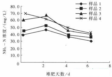 結(jié)果表明,NH3-N的濃度變化,隨著堆肥天數(shù)的增加,浸出液中NH3-N的濃度先升高后逐漸降低。由此可見(jiàn),如果對(duì)城市垃圾進(jìn)行堆肥預(yù)處理,再進(jìn)行衛(wèi)生填埋,滲濾液中NH3-N濃度會(huì)降低,可能有助于降低高有機(jī)物含量、高水分城市垃圾特點(diǎn)所造成的衛(wèi)生填埋場(chǎng)垃圾滲濾液處理的難度。