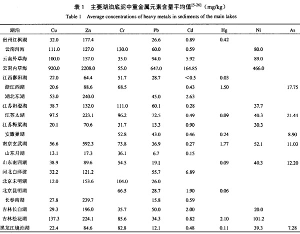 重金屬污染問題是我國水環(huán)境研究人員最早關(guān)注的重要問題之一,由于底泥在水環(huán)境中的重要作用,多數(shù)學者在研究水相中的重金屬污染狀況時,同時也會對水體底泥的重金屬污染狀況進行同步采樣分析。20世紀80年代以來,廣大學者對我國不同地理區(qū)域的湖泊底泥重金屬污染狀況進行了較廣泛的研究,研究所涉及的重金屬元素包括Fe、Mn、Hg、Cd、Zn、Cu、Cr、As、Ni、Se、Co、Ni等,積累了豐富的數(shù)據(jù)。但是,以前的研究主要是針對某一具體區(qū)域的某一具體湖泊而進行底泥重金屬污染的實驗研究,到目前為止,對我國不同區(qū)域的眾多湖泊底泥的重金屬含量及污染情況從整體上進行比較和分析的相關(guān)資料還比較少。本文通過對不同區(qū)域湖泊重金屬元素(主要為Cu、Cd、Pb、Zn、HAs、Ni、Cr8種重金屬)含量及背景值數(shù)據(jù)的搜集和處理加工,對我國湖泊底泥中重金屬污染情況進行了比較和分析,并對重點湖泊底泥重金屬污染程度作出了評價。