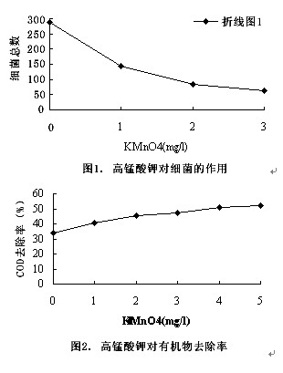 從圖1,2中可以看出,細菌總數(shù)隨KMnO4投量的增加呈下降的趨勢。CODMn的去除率增大。高錳酸鉀投量大于3mg/L時,曲線趨于平緩。即使投量再增加,曲線變化也不明顯,這表明高錳酸鉀對水中有機物有明顯的去除作用,曲線趨于平緩是由于高錳酸鉀對水中有機物基本作用完全而致。