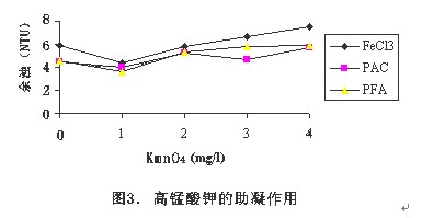 2.1.1 我們在天津新開河水廠,于夏季進行了采用高錳酸鉀替代氯氧化的試驗。源水的