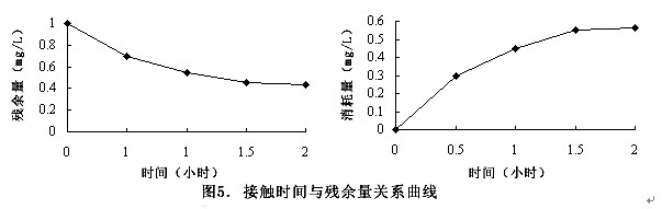 KMnO4與水中有機物的接觸時間又是一個重要參數(shù),圖5是不同接觸時間下KMnO4消耗量的曲線,可以看出,高錳酸鉀與水樣接觸時間越長,消耗量越多,而當時間達到某一定值時,再延長接觸時間,消耗量變化不大。對于灤河水而言,接觸時間應為1小時,此時,高錳酸鉀的濃度為原來的一半,再延長時間,曲線趨于平緩,所以說,在現(xiàn)有工藝條件下合理地采用高錳酸鉀與水的接觸時間,有利于高錳酸鉀充分發(fā)揮作用。