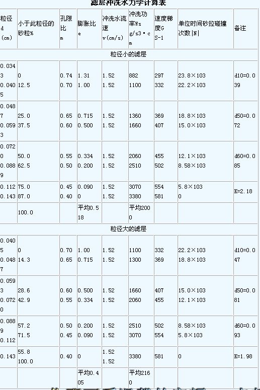 從下表可見(jiàn),粒徑小的濾層,最佳膨脹率為51.8%。粒徑大的濾層,最佳膨脹率為40.5%。砂層組成決定最佳膨脹率大于、等于或小于50%。使最小粒徑砂層孔隙比達(dá)到0.74有決定性意義,建議設(shè)計(jì)濾池沖池強(qiáng)度以此為準(zhǔn)。