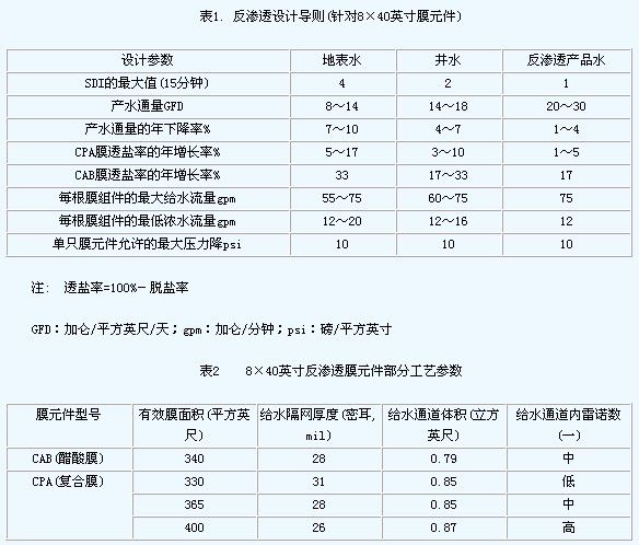 表1中建議的反滲透設計導則注明了對于不同給水水源,壓力容器中膜元件的最大給水流量和最低濃水流量。設定最大給水流量用來保護容器中的第一根反滲透元件,使其給水與濃水壓力降不超過10psi。壓力降高于此值就會使膜組凸出并且使給水隔網(wǎng)變形,從而損壞膜元件。設定最小的濃水流量以保證在容器末端的膜元件有足夠的橫向流速。從而減少了膠體在膜表面上的沉淀,并且減少濃差極化對膜表面的影響。濃差極化是指在膜表面上的鹽濃度高于主體流體濃度的現(xiàn)象。鹽濃縮是因膜表面附近的橫向流速低而造成的(與管子中心的流速高于管子表面的流速的概念相似)。橫向流速越低,膜表面的鹽的反向擴散速度就越低,結(jié)果難溶鹽沉淀的機會增多,而且更多的鹽會透過膜表面。濃差極化的程度可被量化為b值,該值應該小于1.20。
