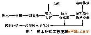 廢水首先流經(jīng)格柵以去除其中的大顆粒污染物,再匯入調(diào)節(jié)池進(jìn)行酸化預(yù)處理以提高可生化性、減輕后續(xù)處理設(shè)施的負(fù)荷。經(jīng)酸化預(yù)處理的廢水由污水泵提升至TS型破乳裝置,進(jìn)行pH自動調(diào)節(jié)及加藥破乳反應(yīng),而后順流至YF—Ⅲ型無動力油水分離器,分離后的污油進(jìn)入廢油收集桶,出水則流入微孔膜生物反應(yīng)器與其中的微生物進(jìn)行充分接觸,水中的有機(jī)污染物被吸附、氧化、分解,同時由微濾膜組件替代沉淀池實(shí)現(xiàn)泥水分離,通過生物降解與微孔膜分離的共同作用使水中的污染物濃度大大降低(可達(dá)到污水排放標(biāo)準(zhǔn))。破乳裝置、油水分離 器及微孔膜生物反應(yīng)器所排出的污泥,經(jīng)管道匯至污泥脫水干化器進(jìn)行濃縮、干化后外運(yùn)至鍋爐作焚燒處理。