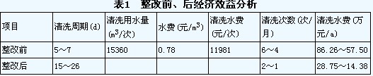 整改前清洗周期為1次/周,整改后則15~26d才清洗一次,洗池次數(shù)減少了50%以上,至少可節(jié)約清洗水費達20萬元/a(見表1)。
