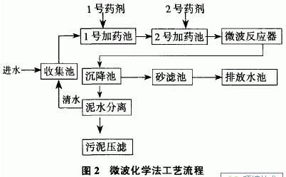微波化學(xué)法處理廢水工藝是近幾年發(fā)展起來的一種新型廢水處理工藝。它利用了微波特有的物理、化學(xué)、生物學(xué)效應(yīng),配合多種化學(xué)藥劑,完成對有機污染物的氧化、分解、吸附、混凝等作用。該方法工藝流程如圖2所示。