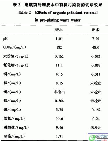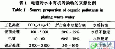 表l為電鍍污水中有機污染物的比例。從表中可以看出電鍍廢水中的有機污染物主要來源于鍍前處理部分,而電鍍工藝本身所占比例較少。
