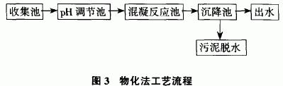物化法工藝試驗是由三角環(huán)保所工作人員自行負責(zé)設(shè)計的。首先在實驗室內(nèi)對物化反應(yīng)所需的藥劑進行了大量的篩選,并對工藝流程及參數(shù)進行了優(yōu)化組合,其去除率為70% ~80%,后又在高平電鍍污水廠進行了3次1 000 L的小型工業(yè)化試驗,均達到了較理想的處理結(jié)果。該方法工藝流程如圖3所示。