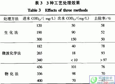 電鍍污水中有機污染物的種類同各地所采用的電鍍工藝與原料有很大的區(qū)別,因此其處理效果也就有所不同。由此也就需要各地同行依據(jù)當?shù)氐木唧w情況,采用不同的工藝與藥劑,以求取得最好的處理效果。即便是去除率最高的微波化學(xué)法,目前在2 000 m3/d處理規(guī)模的設(shè)備上,在2個月的調(diào)試過程中去除率也僅在75%以下,有待于進一步改進。表3為3種工藝處理效果對比。