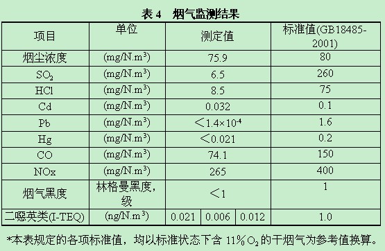 污泥焚燒高溫?zé)煔庵泻泻芏喾N污染物質(zhì),如果不進(jìn)行合理的處理將會(huì)對(duì)環(huán)境造成嚴(yán)重的二次污染,因此大氣污染物排放控制至今仍是焚燒廠要解決的重要問題,尤其是其中的Hg、NOx。此外,國(guó)內(nèi)很多學(xué)者認(rèn)為二惡英也應(yīng)是妨礙污泥焚燒的主要障礙之一。本試驗(yàn)裝置煙氣處理系統(tǒng)由噴霧干燥塔、旋風(fēng)除塵器和生物填料除臭噴淋洗滌塔組成,試驗(yàn)過程中,根據(jù)《生活垃圾焚燒污染控制標(biāo)準(zhǔn)》(GB18485~2001)中規(guī)定的檢測(cè)項(xiàng)目,對(duì)排放尾氣進(jìn)行了檢測(cè),檢測(cè)結(jié)果如表4: