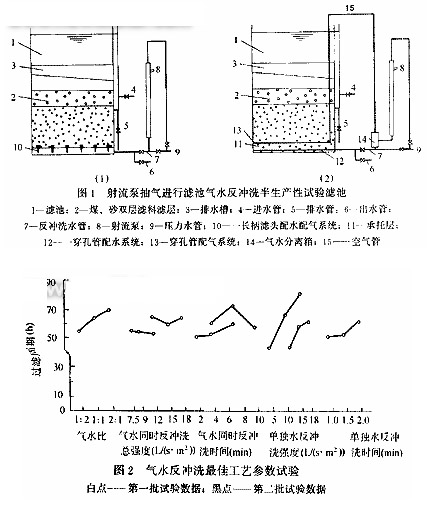 濾池是水處理工程中最常用的設備。濾層沖洗得好壞,對濾池的過濾效果以及工作的經(jīng)濟性有重大影響。氣水反沖洗濾池比單獨用水反沖洗效果好,但需設置大容量空氣壓縮機或鼓風機,由于設備費用高、操作復雜,且工作時震動大,噪聲強,推廣緩慢。用射流泵進行濾池氣水反沖洗,則能大大降低設備和運行費用,簡化操作,減小噪聲,有利于推廣。該項技術已申請專利。本文重點介紹半生產(chǎn)性試驗研究的成果。