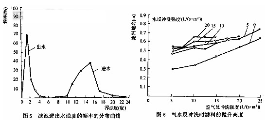 圖4還繪出了兩個試驗濾池出水濁度的變化情況(多次試驗的平均值)。由圖可見,濾池出水濁度在整個過濾周期里穩(wěn)定少變,并且—般都小于2度,出水水質良好。圖5繪出了試驗濾池進水濁度和出水濁度的頻率分布曲線。由圖可見,進水濁度的中值(50%)約為13度,出水濁度的中值約為1度,表明濾層截污能力始終是很強的。