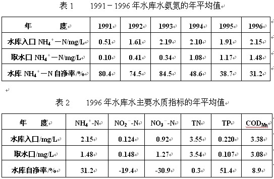 我國南方的一座庫容為3500多萬m3的城市供水水庫,主要依靠廣東東江的水通過80多公里長的輸水明渠和提升泵站組成的引水工程將水輸入該水庫。20世紀90年代以來,由于明渠所經(jīng)地區(qū)有越來越多的生活污水和生產(chǎn)廢水排入渠中,導致進水庫水的水質(zhì)不斷惡化。水庫雖有一定的自凈能力,但由于水庫的污染負荷受納量超過了水庫自凈能力,長年的污染累積逐漸破壞水庫生態(tài)平衡,導致水庫自凈能力逐漸下降。表1顯示1991年至1996年該水庫入口處和位于水庫另端的自來水廠取水口處的各年度氨氮的年平均值,由于入庫水的氨氮連年較高,且越來越差,水庫的氨氮自凈率由1993年以前的80%左右銳降到1996年的30%左右,水庫的生態(tài)環(huán)境遭到嚴重威脅。表2顯示1996年該水庫入口和水廠取水口的主要污染指標的年平均值。從表2的有關數(shù)據(jù)可知:由于水庫連續(xù)多年超負荷納污,庫中水質(zhì)已達不容忽視的富營養(yǎng)化程度,必須盡早采取有效措施來改善水庫水質(zhì),以有利于從該水庫取水的水廠能提高出廠水水質(zhì)。