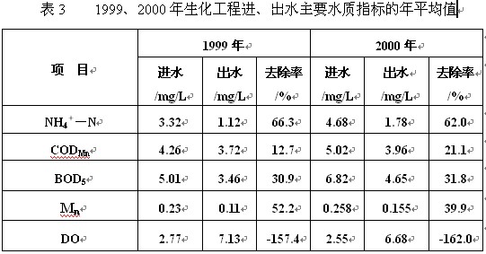 該水庫生化工程投入運行后,1999年及2000年的生化工程進水和出水的氨氮、CODMn、BOD5等水質(zhì)指標的年平均值和年平均去除率列于表3。由表3可知:雖然水庫入口的水中氨氮及CODMn等指標比1996年的水庫入口水進一步加劇惡化,但由于經(jīng)生化工程的有效生物降解處理,顯著改善了生化工程出水的水質(zhì),明顯減輕了水庫的納污負荷。