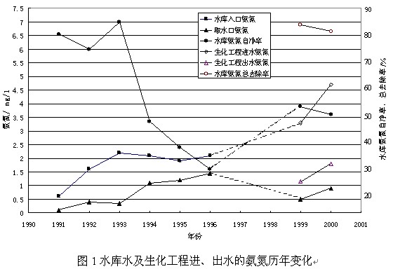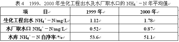 1999年及2000年的生化工程出水和水廠取水的水中NH4+-N年平均值以及水庫NH4+-N自凈率,列于表4。