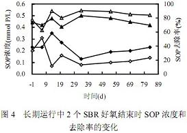 酸的第 6d,SBR2 的 SOP 去除率卻低于 SBR17.7%.顯然,突然將進水中補加的乙酸換為丙酸,將導(dǎo)致系統(tǒng)除磷功能的降低.隨著培養(yǎng)時間的增加,從第 13d 以后,SBR2 的 SOP 去除率平均高于SBR1 10%以上.這表明,SBR2系統(tǒng)中的聚磷菌經(jīng)過一段時間的馴化后,其除磷效果得到顯著提高,而且比 SBR1 還高.圖 5 還給出了好氧結(jié)束時SOP 濃度變化.可見,在 SBR2 運行穩(wěn)定后(13~ 83d),其SOP 的濃度都低于 SBR1。