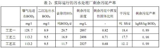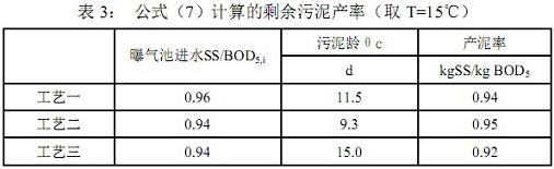 污水處理廠的剩余污泥產率可通過在曝氣池混合液穩(wěn)定條件下測定曝氣池進水和二沉池出水的BOD5、剩余污泥濃度和排出剩余污泥量來獲得。測定工作在北京污水處理廠進行,選擇的污水處理廠工藝分別為倒置的A2O(以下簡稱為工藝一)、A/O(不帶內回流,以下簡稱為工藝二)和A/O(帶內回流,下簡稱為工藝三),共測定了三種工藝,每種工藝均設有初沉池。測定時間為11月和12月兩個月。污水溫度在12-18攝氏度,平均污水溫度約15攝氏度。表2給出兩個月測定的平均結果,表3給出按公式(7)計算結果。