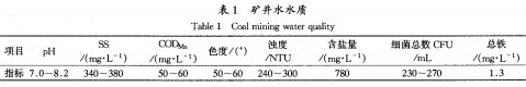 試驗(yàn)用水取自某礦井水處理廠處理煤礦原煤開采產(chǎn)生的礦井水,處理后的清水主要用于洗煤、綠化以及礦區(qū)職工洗浴及生活用水.原礦井水水質(zhì)見表1。