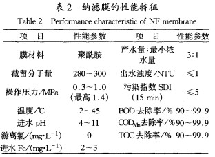 納濾膜是一種介于超濾和反滲透的分離膜,本裝置采用的是美國Trisep公司的TS80—4040納濾膜,其基本性能見表2。并聯(lián)方式運(yùn)行,操作壓力為0.7MPa,淡水回收率75%。