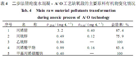 當(dāng)各階段反應(yīng)均達(dá)到穩(wěn)定狀態(tài)后,分別取進(jìn)出水進(jìn)行色譜/質(zhì)譜分析,具體方法及技術(shù)路線見文獻(xiàn)[1]。分析數(shù)據(jù)采用HP定量軟件自動(dòng)積分檢索處理。廢水中所含的主要生產(chǎn)原料有機(jī)物丙烯腈、乙硫醇、丙硫醇、丙烯酸甲酯、甲基丙烯磺酸鈉,因前四者為揮發(fā)性有機(jī)物,后者須作衍生化處理測(cè)定,故單獨(dú)列出這五種化合物經(jīng)各級(jí)處理后的變化情況。