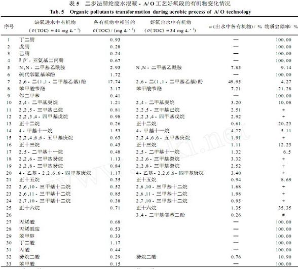 表5、6表明,廢水經(jīng)好氧段處理,缺氧段出水中所含的丙烯腈、丁二腈、戊腈、己腈、β,β′-亞氨基二丙腈、丙硫醇、丙烯酸甲酯、鄰二甲苯、硫代鄰氨基苯等均達(dá)到徹底去除,中間產(chǎn)物丙烯酰胺、丁二酸、苯甲醇、丙酸、丙烯酸、苯甲酸等亦降解完全,癸烷二酸有部分降解,3,4-二甲基鄰苯二酚為新增物質(zhì)。其它組分如正十二烷、正十三烷、正十五烷、正十六烷、4-甲基十一烷、2,5-二甲基十一烷、2,6-二(1,1-二甲基乙基)酚、N,N-二甲基乙酰胺及苯甲酸芐酯等繼續(xù)有所降解,但降解率較低;其它側(cè)鏈烷烴:壬烷異構(gòu)體、十二烷異構(gòu)體、十三烷異構(gòu)體、十五烷異構(gòu)體等仍無(wú)降解。好氧段出水中僅2,6-二(1,1-二甲基乙基)酚的質(zhì)量分?jǐn)?shù)就為49。95%,其次是N,N-二甲基乙酰胺、苯甲酸芐酯、烷烴類,這些均表現(xiàn)為難降解有機(jī)物。