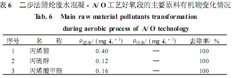 綜合上述試驗(yàn)分析研究結(jié)果,對(duì)二步法腈綸廢水中的有機(jī)物在處理過程中表現(xiàn)出的生物降解性進(jìn)行分類:①有機(jī)腈類(丙烯腈、丁二腈、戊腈、己腈、β,β′-亞氨基二丙腈)易生物降解;②2,2′-二硫基乙醇、硫醇(乙硫醇、丙硫醇)、硫代鄰氨基苯酚、丙烯酸甲酯、甲基丙烯磺酸鈉、鄰二甲苯、易生物降解;③正烷烴類:正十二烷、正十三烷、正十五烷、正十六烷可生物降解;④2,6-二(1,1-二甲基乙基)酚、N,N-二甲基乙酰胺、側(cè)鏈烷烴(壬烷異構(gòu)體、十二烷異構(gòu)件、十三烷異構(gòu)體、十五烷異構(gòu)體)及苯甲酸芐酯難生物降解。對(duì)比文獻(xiàn)[4]中對(duì)腈綸廢水中有機(jī)物的生物降解性的理論研究分析,結(jié)果有差異的有苯甲酸芐酯及N,N-二甲基乙酰胺,它們?cè)谠囼?yàn)中表現(xiàn)為難生物降解,而理論分析結(jié)果為可生物降解及易生物降解,其余各化合物生物降解性能的理論分析和試驗(yàn)情況相符。