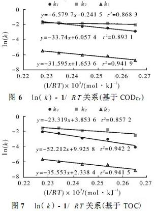 由圖6、7可得表觀活化能Ea和頻率因子A(見(jiàn)表4)。結(jié)果表明,基于CODCr的表觀活化能為:有機(jī)物氧化成終產(chǎn)物為33.74kJ/mol,氧化成低級(jí)酸為6.58kJ/mol,由低級(jí)酸氧化成終產(chǎn)物為31.60kJ/mol,可見(jiàn)有機(jī)物氧化成低級(jí)酸的反應(yīng)能較快進(jìn)行,而直接氧化或低級(jí)酸氧化成終產(chǎn)物的速度很慢,升高溫度主要加快了后兩種途徑的反應(yīng)速度。