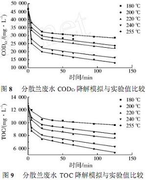 由表4動(dòng)力學(xué)參數(shù)預(yù)測(cè)CODCr和TOC降解情況(見(jiàn)圖8、9,圖中符號(hào)為實(shí)驗(yàn)數(shù)據(jù),線為模型預(yù)測(cè)),CODCr和TOC預(yù)測(cè)值與實(shí)驗(yàn)值相當(dāng)吻合,CODCr和TOC去除率最大偏差分別為2.00%和1.80%,說(shuō)明該模型解釋分散蘭廢水的濕式氧化宏觀過(guò)程是合理的。