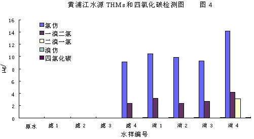 圖3為黃浦江原水,前后加二氧化氯,與前后加化合氯對(duì)比。測(cè)定結(jié)果表明,閔行原水不含三鹵甲烷和四氯化碳(低于檢測(cè)限),前加不同量二氧化氯后,濾1、濾2、濾3除一溴二氯甲烷分別為0.89、0.71、<0.07mg/l外,無(wú)其他三鹵甲烷和四氯化碳產(chǎn)生,前加氯后濾4的氯仿為6.2mg/l,一溴二氯甲烷為1.1mg/l,一氯二溴甲烷為<0.2mg/l,無(wú)三溴甲烷,四氯化碳為0.18mg/l。后加二氧化氯,消1、消2、消3的氯仿為<0.5mg/l,有微量一溴二氯甲烷,無(wú)一氯二溴甲烷,無(wú)三溴甲烷和四氯化碳。后加氯的水樣消4,氯仿升高為9.6mg/l,一溴二氯甲烷為3.4mg/l,無(wú)一氯二溴甲烷,無(wú)三溴甲烷,四氯化碳為0.08mg/l。