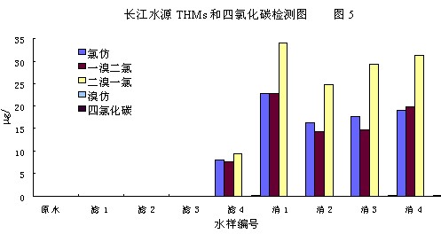 圖5為長(zhǎng)江原水,前加二氧化氯后加游離氯,與前后游離氯對(duì)比。測(cè)定結(jié)果表明,長(zhǎng)江原水不含三鹵甲烷和四氯化碳(低于檢測(cè)限),前加不同量二氧化氯后,濾1、濾2、濾3均無(wú)三鹵甲烷和四氯化碳產(chǎn)生,前加氯后濾4的氯仿為8.0mg/l,一溴二氯甲烷為7.7mg/l,一氯二溴甲烷9.4mg/l,無(wú)三溴甲烷,四氯化碳升高為0.1mg/l。后加氯后,4個(gè)消毒水樣的氯仿升高為20.9、16.2、17.7和19.1mg/l,一溴二氯甲烷升高為22.7 14.4 14.7 和19.7mg/l,一氯二溴甲烷為34.1、24.7、29.4、31.4 mg/l,無(wú)三溴甲烷生成,四氯化碳為0.08-0.09mg/l。