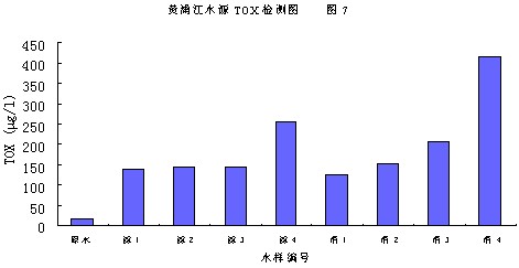 圖7為黃浦江原水,前后加二氧化氯,與前后加游離氯對(duì)比。測(cè)定結(jié)果表明,閔行原水TOX為18.1mg/l,加二氧化氯,濾后水1、2、3平均為141.8mg/l,升高7.8倍。消毒水1、2、3平均為161.6mg/l,升高8.9倍。加氯濾后水4,TOX256.7mg/l,比原水升高14.2倍,消毒水4,415.2mg/l,升高22.9倍。
