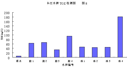 圖8為長(zhǎng)江原水,前后加二氧化氯,與前后加游離氯對(duì)比。測(cè)定結(jié)果表明,長(zhǎng)江原水TOX為6.5mg/l,加二氧化氯,濾后水1、2、3平均為54.4mg/l,升高8.4倍。消毒水1、2、3平均為45.2mg/l,升高7倍。加氯濾后水4,TOX94.8mg/l,比原水升高14.6倍,消毒水4,180.9mg/l,升高27.8倍。以上結(jié)果說明,無(wú)論二氧化氯或氯處理工藝均會(huì)使TOX值升高。加游離氯時(shí),氯與水中的有機(jī)物發(fā)生氯代反應(yīng),會(huì)生成大量的氯化有機(jī)物質(zhì),生成量和水中的有機(jī)物濃度、種類有關(guān),也與加氯量成正相關(guān)。使用二氧化氯,可降低TOX的生成量,前后加二氧化氯比氯降低,長(zhǎng)江水降低了75%,閔行水降低了60%!