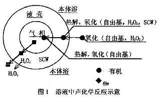 超聲降解有機(jī)物是水處理中高級(jí)氧化(AOPs)技術(shù)的一種。但它又與其它AOPs技術(shù)有所區(qū)別。即在超聲空化過(guò)程中,除了能產(chǎn)生具有強(qiáng)氧化能力的自由基以外,還存在高溫?zé)峤庾饔,還可能存在瞬態(tài)超臨界水(SCW)加速氧化。超聲空化是指液體中微小泡核在超聲波作用下被激化,表現(xiàn)為泡核的振蕩、生長(zhǎng)、收縮、崩潰等一系列動(dòng)力學(xué)過(guò)程?栈菟查g崩潰時(shí)會(huì)產(chǎn)生高溫(5000℃以上)和高壓(50~1OOMPa)[3]?栈輧(nèi)(氣相)的水蒸汽在高溫、高壓下裂解為·0H、·H自由基以及次級(jí)自由基·OOH等。部分自由基又會(huì)結(jié)合形成H2O2,空化泡崩潰產(chǎn)生的沖擊波和射流使這些自由基和H2O2進(jìn)入本體溶液。聲化學(xué)反應(yīng)如圖1所示。在空化泡內(nèi)(氣相),有機(jī)物降解主要依靠高溫?zé)峤夂洼^高濃度的自由基氧化:在氣—液界面的液殼區(qū)內(nèi),有機(jī)物被自由基、H202及SCW氧化并部分被熱解;在本體溶液中,有機(jī)物主要被自由基和H2O2氧化。圖1只是大體的反應(yīng)位置,實(shí)際聲化學(xué)反應(yīng)比圖1所示要復(fù)雜得多。對(duì)于不同物化性質(zhì)的有機(jī)物質(zhì),主要作用機(jī)理也會(huì)有所不同,見(jiàn)后文。