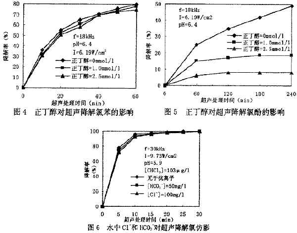由圖4~圖6可知,對(duì)于氯苯、氯仿兩種揮發(fā)性有物,自由基清除劑對(duì)超聲降解效果幾乎無(wú)影響,說(shuō)明揮發(fā)性物質(zhì)的降解主要是高溫?zé)峤,自由基氧化作用極微。自由基清除劑對(duì)難揮發(fā)的4—氯酚降解效果影響很大,正丁醇投量增加,降解率下降。例如:經(jīng)240min超聲處理,不加正丁醇時(shí),4-氯酚降解率為51.8%,正丁醇投量為2.5mmol/L時(shí),4-氯酚降解率降至9.6%,說(shuō)明難揮發(fā)的4-氯酚的超聲降解主要是自由基氧化的結(jié)果。