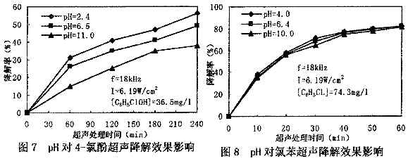 pH值影響水中有機(jī)物存在形態(tài)。當(dāng)水PH值低時(shí),水中有機(jī)物以分子形態(tài)為主;當(dāng)pH值高時(shí)水中有機(jī)物以離子形態(tài)為主。分子容易接近空化泡的氣液界面,繼而蒸發(fā)到氣泡中進(jìn)行熱解和自由基反應(yīng);離子則不易接近氣液截面,也很難進(jìn)入空化泡內(nèi),故有機(jī)物降解主要靠本體溶液中自由基氧化。圖7為pH值對(duì)難揮發(fā)的4-氯酚超聲降解效果的影響[2]。由圖7可知,經(jīng)240min超聲處理,pH值分別2.4、6.5和11.0時(shí),4-氯酚降解率分別為56.7%、51.8%和41.0%,說(shuō)明pH值對(duì)不揮發(fā)或難揮發(fā)有機(jī)物的超產(chǎn)降解效果影響較大。在低PH值下,4—氯酚的降解除了自由基氧化外;還存在部分分子態(tài)4—氯酚被高溫?zé)峤,故超聲降解效果較好。