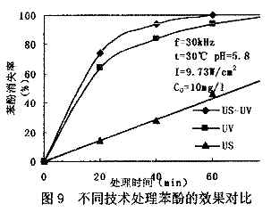 采用單獨(dú)US、單獨(dú)UV和US-UV聯(lián)用技術(shù)處理?yè)]發(fā)性差的苯酚效果見(jiàn)圖9和表1[1]。由圖9可知,由于US輻照所產(chǎn)生的自由基(·OH)少,故單獨(dú)US對(duì)苯酚的降解效果不如W。從苯酚消失率看,三種技術(shù)降解效果順序?yàn)椋篣S—UV>UV>US。但從表1可知,UV降解苯酚時(shí),TOC的去除效果很差,80min的TOC去除率仍為零。TOC去除率表示有機(jī)物礦化程度,能更好地反映處理效果。苯酚的消失率小于TOC去除率,表明苯酚在降解過(guò)程中產(chǎn)生一系列中間產(chǎn)物,如鄰苯二酚、對(duì)苯二酚、間苯二酚、苯醌及苯環(huán)斷裂后形成脂肪酸等,W輻照苯酚時(shí),往往只能將苯酚降解為中間產(chǎn)物,而不能進(jìn)一步礦化,故苯酚消失率雖較高,但TOC去除率很低。US降解苯酚雖然也生成中間產(chǎn)物,但由于US的降解是多種作用相結(jié)合,包括自由基、超臨界水氧化和部分高溫?zé)峤,故可使部分中間產(chǎn)物達(dá)到礦化程度。US—W對(duì)TOC去除率能明顯提高,其原因可能是US先產(chǎn)生的·0H有部分又會(huì)結(jié)合成H2O2。H2O2經(jīng)UV輻照后復(fù)活成·0U,提高了水中·0H濃度,從而提高了TOC去除率。故從TOC去除率而言,US-UV技術(shù)存在著US和UV的協(xié)同作用。