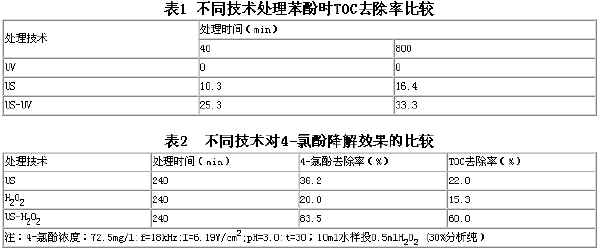 采用單獨(dú)US、單獨(dú)H2O2和US-H2O2聯(lián)用技術(shù)處理4-氯酚的效果見(jiàn)表2[2]。由表2可知,US—H2O2無(wú)論是對(duì)4-氯酚或TOC而言,其去除率都大于單獨(dú)US和單獨(dú)H2O2去除率的簡(jiǎn)單疊加,說(shuō)明US—H2O2技術(shù)明顯具有US和H2O2的協(xié)同作用。協(xié)同作用機(jī)理可能是:(1)在IJS作用下,4-氯酚分子鍵斷裂,更易被H2O2氧化;(2)單獨(dú)US作用所產(chǎn)生的自由基(·OH)較少,加入比02后,自由基濃度大大增加;(3)US所產(chǎn)生的射流有助于自由基和H2O2更均勻地分散在水中,有利于4-氯酚降解。