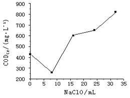 從上圖1可以看出,加入了氧化劑,CODCr的值反而增加了,并且隨著氧化劑用量的增加,CODCr值逐漸增加。這是因為NaClO使染料分子的偶氮鍵斷裂,原來的大分子變成小分子,有利于K2Cr2O7的氧化從而使CODCr增高;從上圖2可以看出,加入了氧化劑,色度的去除率即顯著提高,并且隨著氧化劑用量的增加,色度的去除率逐漸增加,但當氧化劑的量達24mL以后時,色度的去除率基本不再增加。