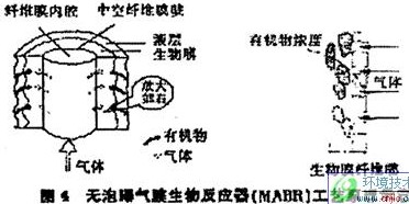 無泡曝氣生物反應(yīng)器(Membrane Aeration Bioiflm Reactor),簡稱為MABR,由中空纖維膜填料部分和水流部分組成。生物膜所需要的氧氣是通過纖維束填料供給的,中空纖維膜不僅起著供氧作用,同時又是固著生物膜的載體。圖 4為無泡曝氣膜生物反應(yīng)器處理污水原理圖。即,純氧或空氣通過中空纖維膜的微孔為生物膜進行無泡曝氣.在中空纖維膜的外側(cè)形成的生物膜與污水充分接觸.污水中所含的有機物被生物膜吸附和氧化分解.從而使污水得到凈化。