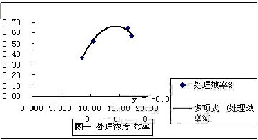 由圖可以得出,濃度變化時(shí)處理效率也相應(yīng)的變動(dòng),由圖表可以得出方程:y=-0.0091×X2+0.261X-1.2062 由此可以積分知道最佳的濃度是14.5mg/l,此時(shí)的處理效率最高是66.5%。