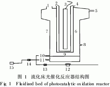 1.加料口,排氣口;2.冷凝水進(jìn)口;3.高壓汞燈;4.冷凝水出口; 5.出水口;6.石英冷肼;7.反應(yīng)瓶;8.取樣口;9.曝氣板;10.進(jìn)水口; 11.進(jìn)氣口;12.泵;13.液體流量計;14.氣體流量計;15.空壓機